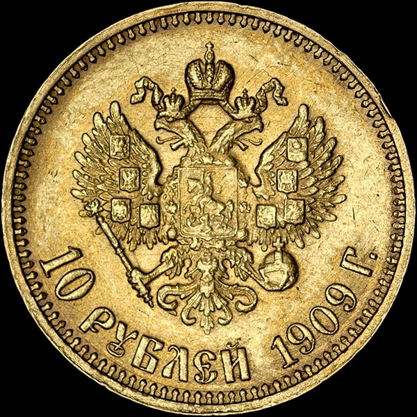 10 РУБЛЕЙ 1909 Г.Бурт украшен фигурными зубцами.